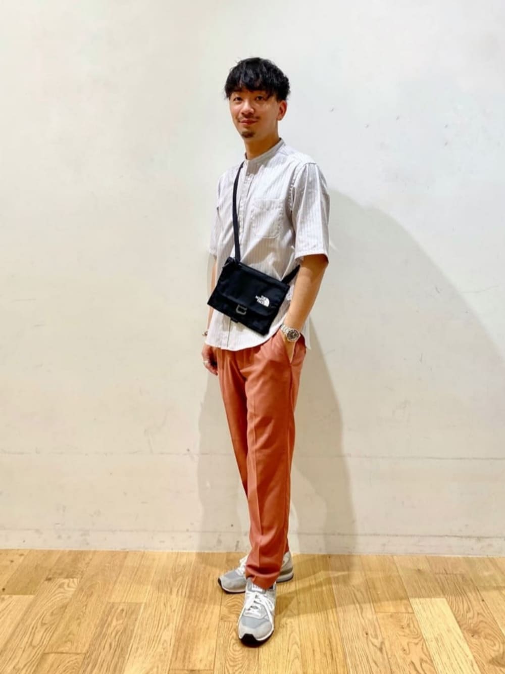 身長:179cm 清涼感のあるストライプ柄のシャツにオレンジのオルマイパンツでコーディネートしました。 差し色にオレンジを入れることでアクセントをつけました。