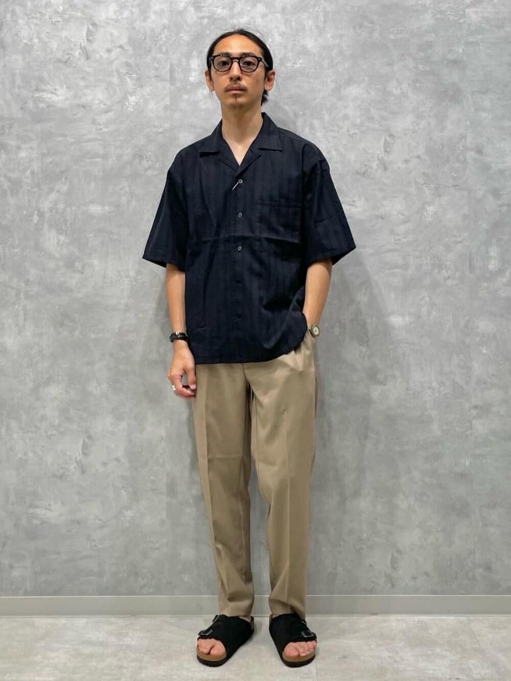 身長:170cm ネイビーのシャツとベージュのパンツで大人っぽいスタイリングにしました。 サングラスや小物でアクセントを加えるのがオススメです。