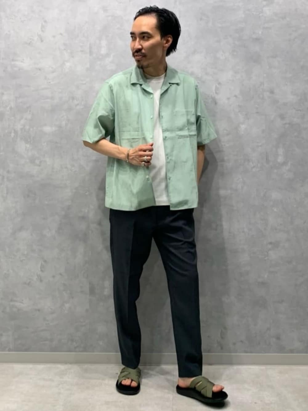 身長:175cm ホワイト×グリーンのキーカラーを使いカジュアルなコーディネートを組んでみました。暑い夏にオススメの涼しい着心地のコーディネートです。