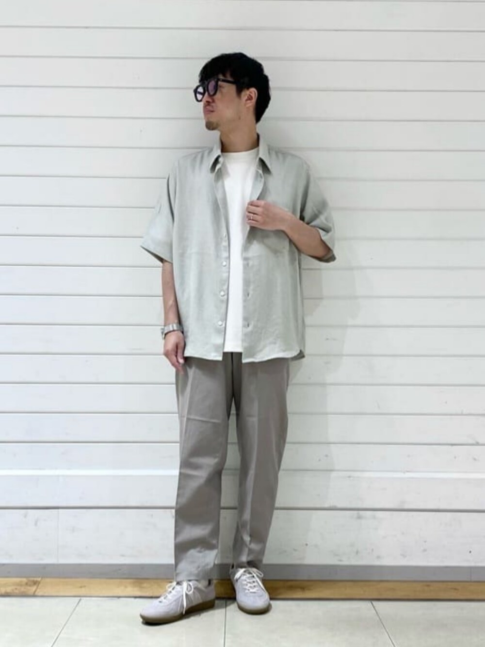 身長:169cm グリーンレーベル定番のジャストルーズシリーズのシャツを着用したリラックススタイルです。色はナチュラルカラーで統一し大人びた雰囲気に仕上げました。グリーンレーベルらしい清潔感溢れるオススメスタイルです。