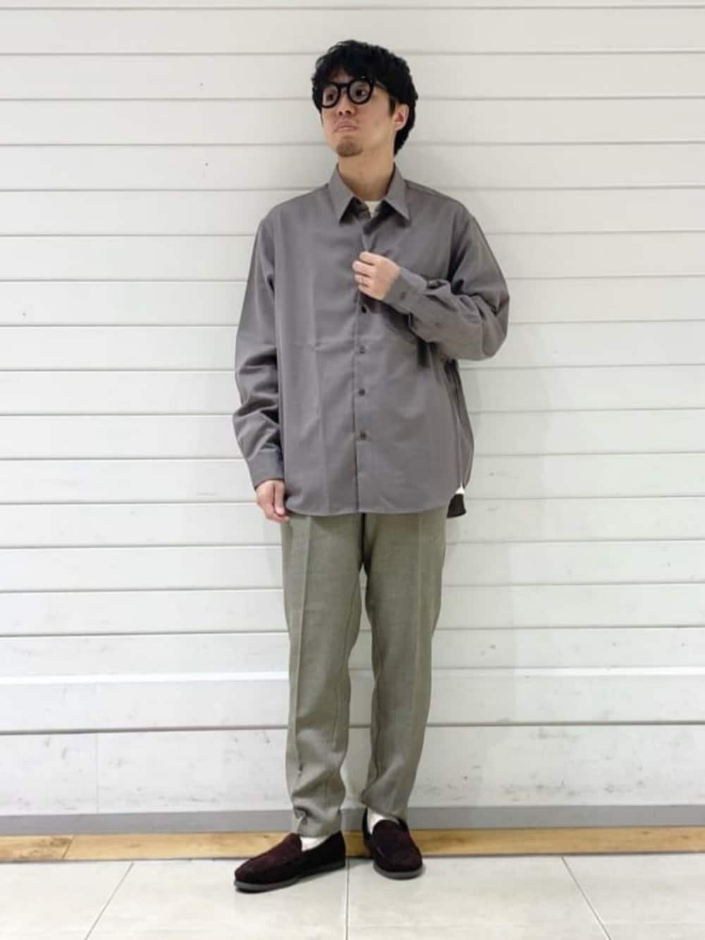 身長:169cm 秋らしいブラウンベースでスタイリングしました。ウール混のシャツにオルマイシリーズのパンツを組み合わせ、足元は別注のデッキローファーをチョイス。程よい品と抜け感が魅力の初秋スタイルです。