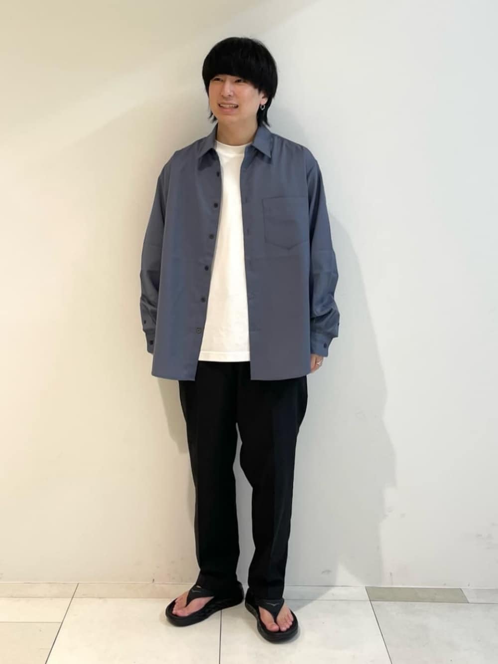 身長:164cm 長袖シャツのスタイルですが、サンダル合わせをすることで今の時期から着用可能なコーディネートになります。 爽やかな配色でコーディネートしました。
