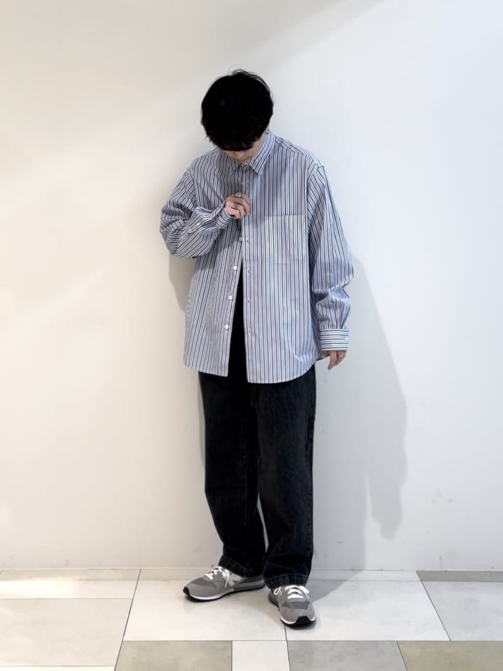 身長:164cm 柄と生地感がキレイめなシャツなので、デニムとスニーカーでカジュアルに合わせてます。 全体的にゆったりめなシルエットだとよりカジュアル感が出ます。