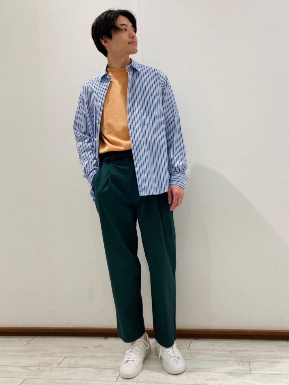 身長:173cm 明るいはっきりしたオレンジの上にシャツを羽織り明るさを抑えています。 前のボタンは開けても良いですが途中まで閉めてインナーを覗かせる程度でも大丈夫です。
