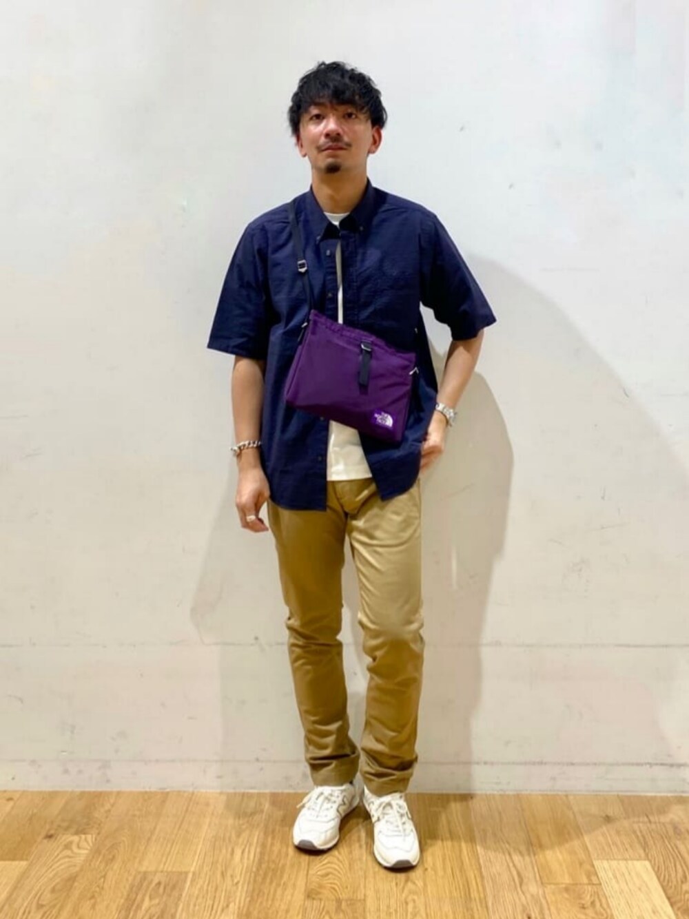 身長:179cm 大人カジュアルシャツスタイルをコーディネートを意識しました。 別注のNBにコットンパンツを合わせることでラフな印象にしました。
