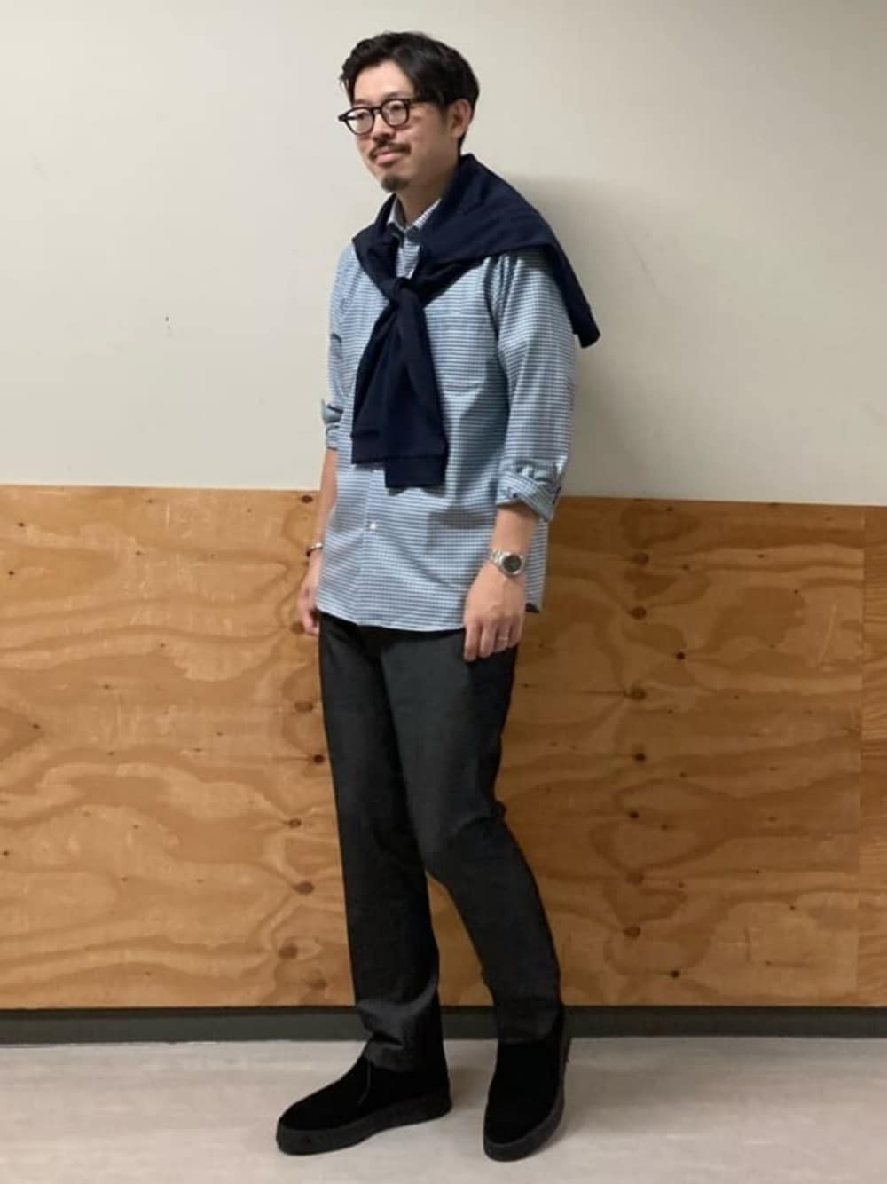 身長:175cm アウトしても着られるシャツをベースにマッドガードのブーツを合わせ、 スティーブマックイーンへの憧れを表現しました。