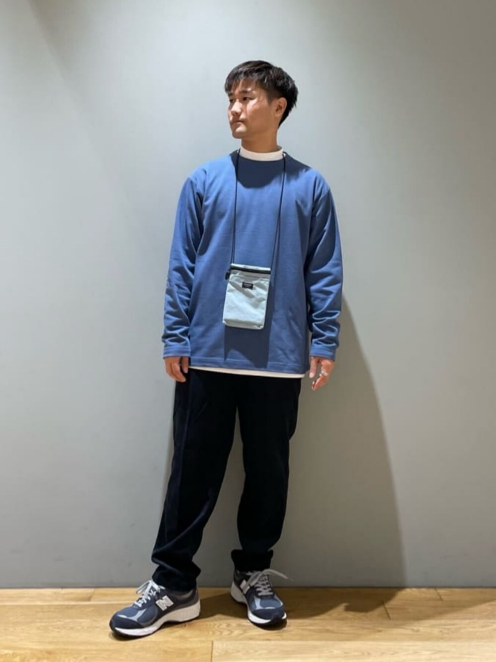 身長:164cm ブルーを意識してコーディネートしました。トップスは1枚でレイヤードになっているので着こなし感を出せます。ボトムスは季節感のあるコーデュロイにってます。センタープレスも入っておりキレイめなスタイリングにもおすすめです。