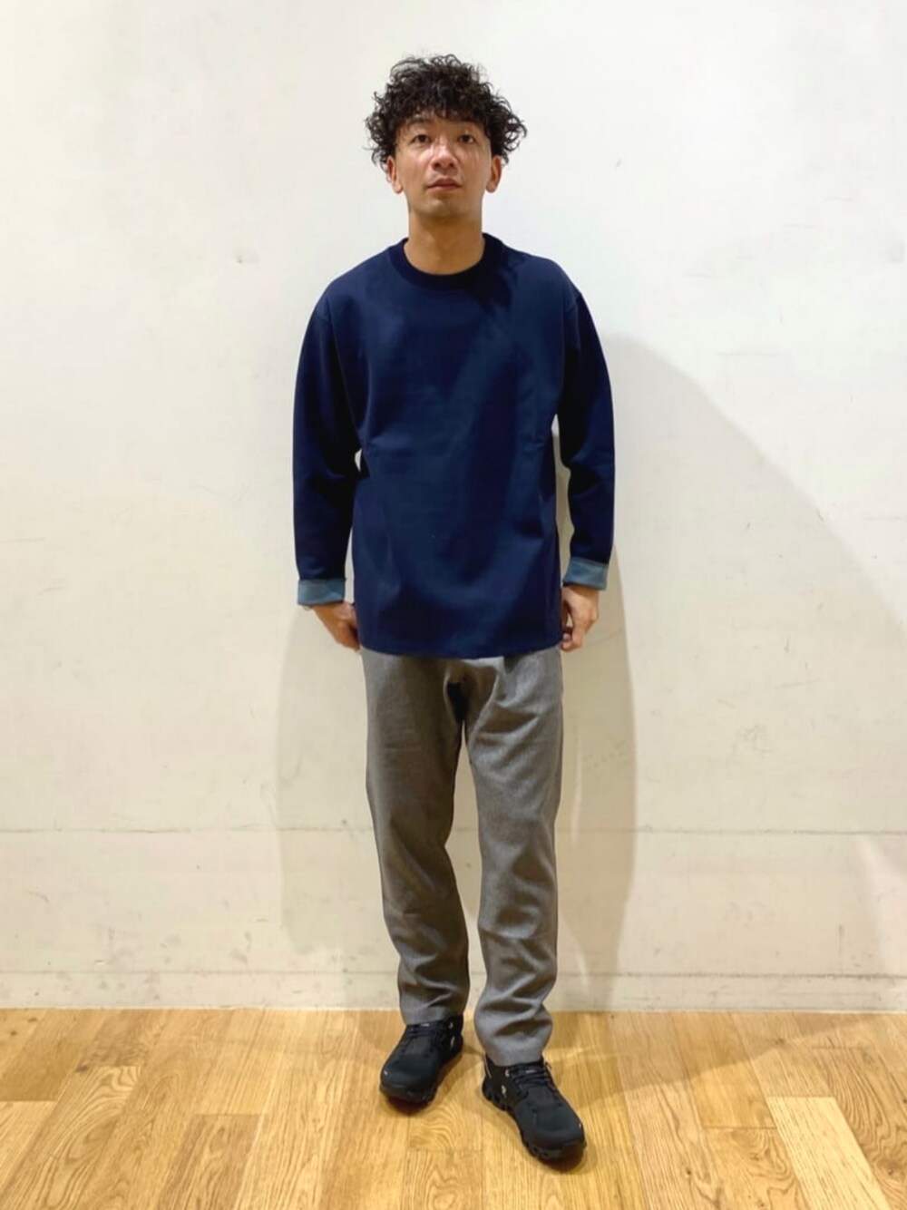 身長:179cm グリーンレーベルリラクシングの定番のダブルフェイスクルーのカットソーをGRAMICCIのボトムスでコーディネートしました。 深みのあるネイビーが大人な雰囲気に。 足元はスポーティーなスニーカーでアクセントをつけました。
