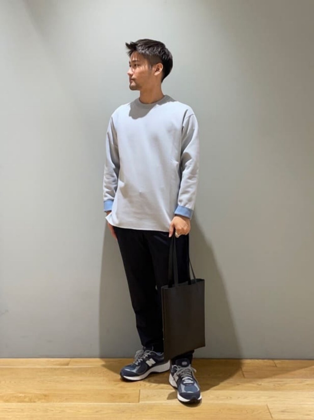 身長:164cm ダブルフェイスクルーネックTシャツを着用しました。首元が特徴的で、お袖もロールアップして着ていただくとアクセントになります。秋服でおススメです。