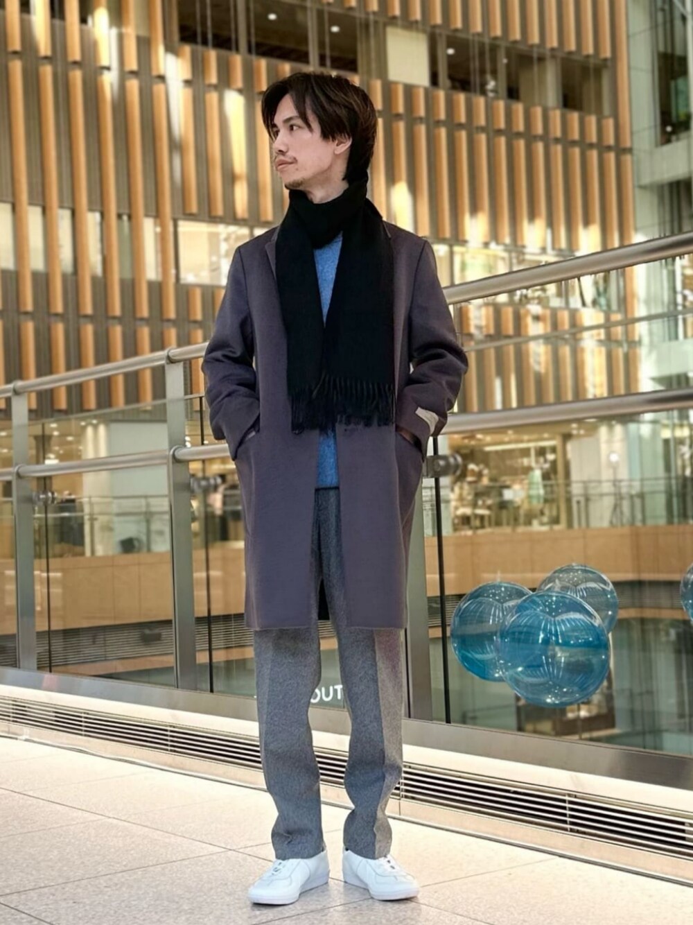 身長:169cm チェスターコートを普段のキレイめカジュアルテイストにスタイリングしました。 全体的に明るめのカラーで合わせ、ブラックのマフラーで引き締めています。