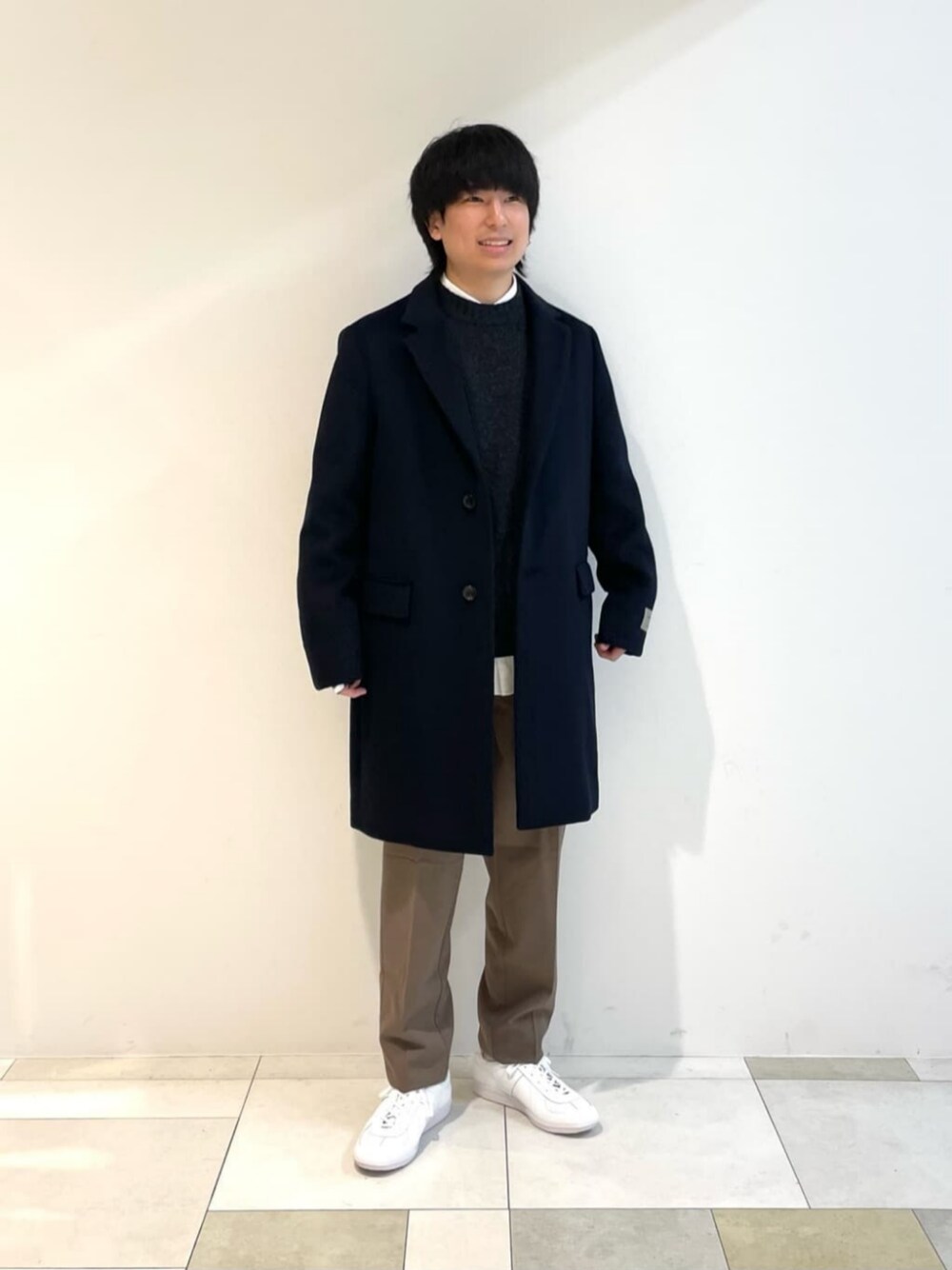 身長:164cm キレイめなチェスターコートに合わせて、全体的に大人っぽくまとめました。 細めのパンツを合わせるとすらっと見え、スタイルが良く見えます。 足元は程よくラフにスニーカーを合わせました。