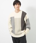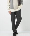 身長:177cm ダークトーン上下のシックな雰囲気に、白系のニットと、スニーカーを合わせてクリーンさをプラス。 マフラーのブルーを差し色にしました。 ニットはアゼ編みで着心地もよく、一枚でも主役になる柄です