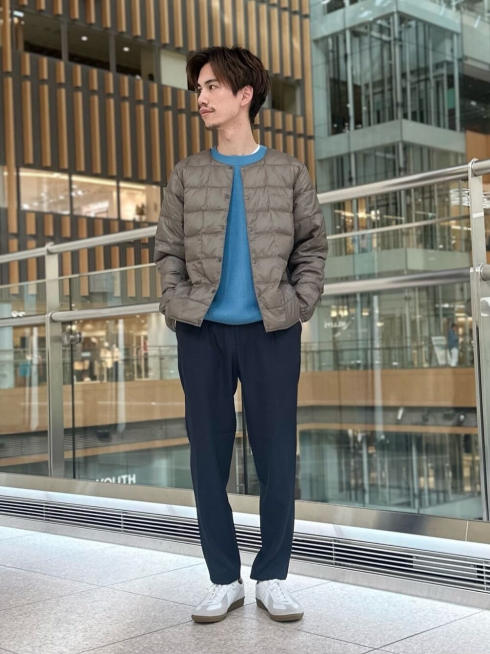 身長:169cm ニットとパンツをカラーを同系色で合わせ、爽やかな印象を作りました。 アウターは別のカラーを取り入れ差し色を入れました。