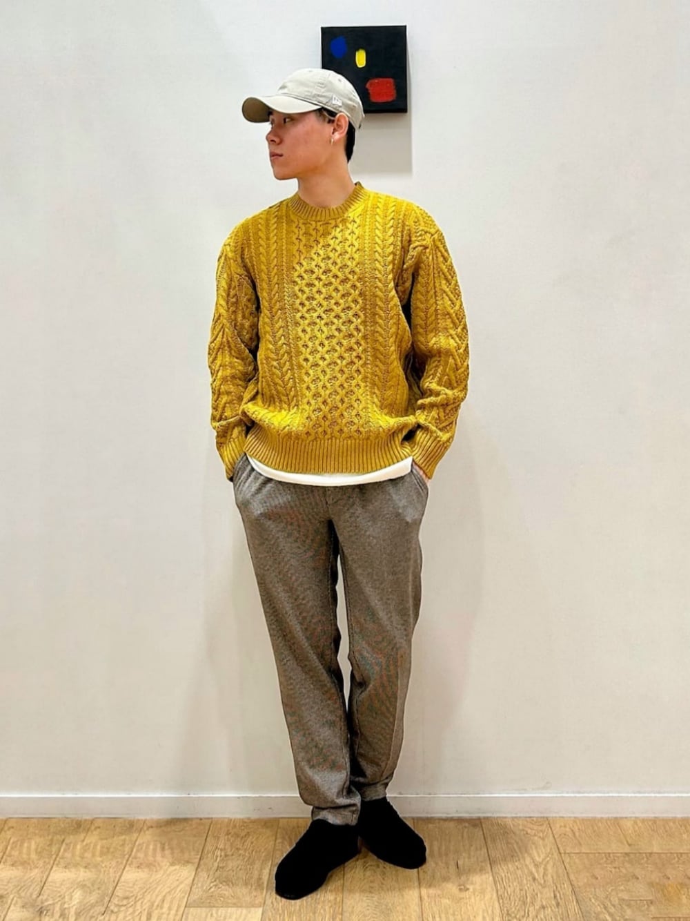 身長:170cm 同じ暖色系の色味でニットとパンツを合わせる事で統一感を出してみました。