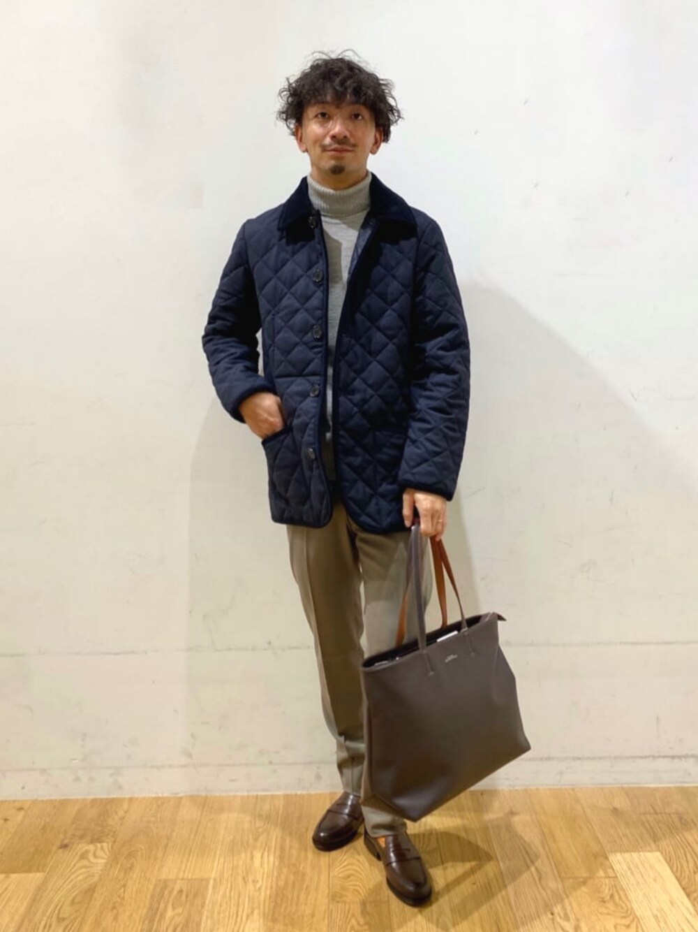 身長:179cm ビジネススタイルにタートルネックタイプのニットを合わせてコーディネートしました。 全体的に色を明るくし、軽さを出しました。