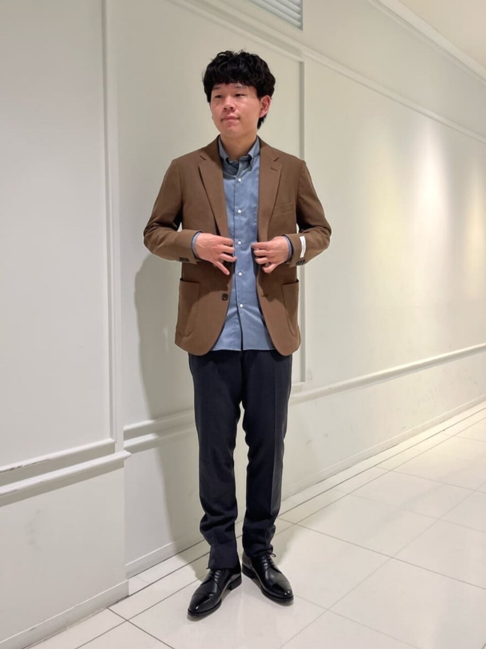 身長:179cm ジャケットを羽織ったビジネスカジュアルスタイルにしてみました。 ブラウンのジャケットは少し雰囲気を出してくれるのでグレーやネイビーの次におすすめのお色です。