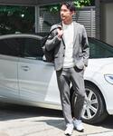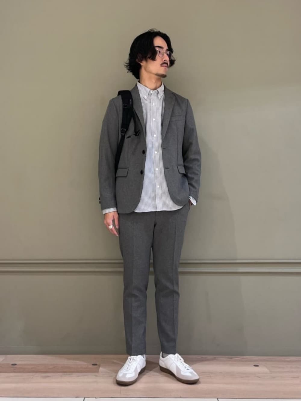 身長:182cm 人気のJUST FITシリーズのセットアップで、定番ビジネスカジュアルのコーディネートを組みました。 ノータイで足元はスニーカーで軽さを出しました。