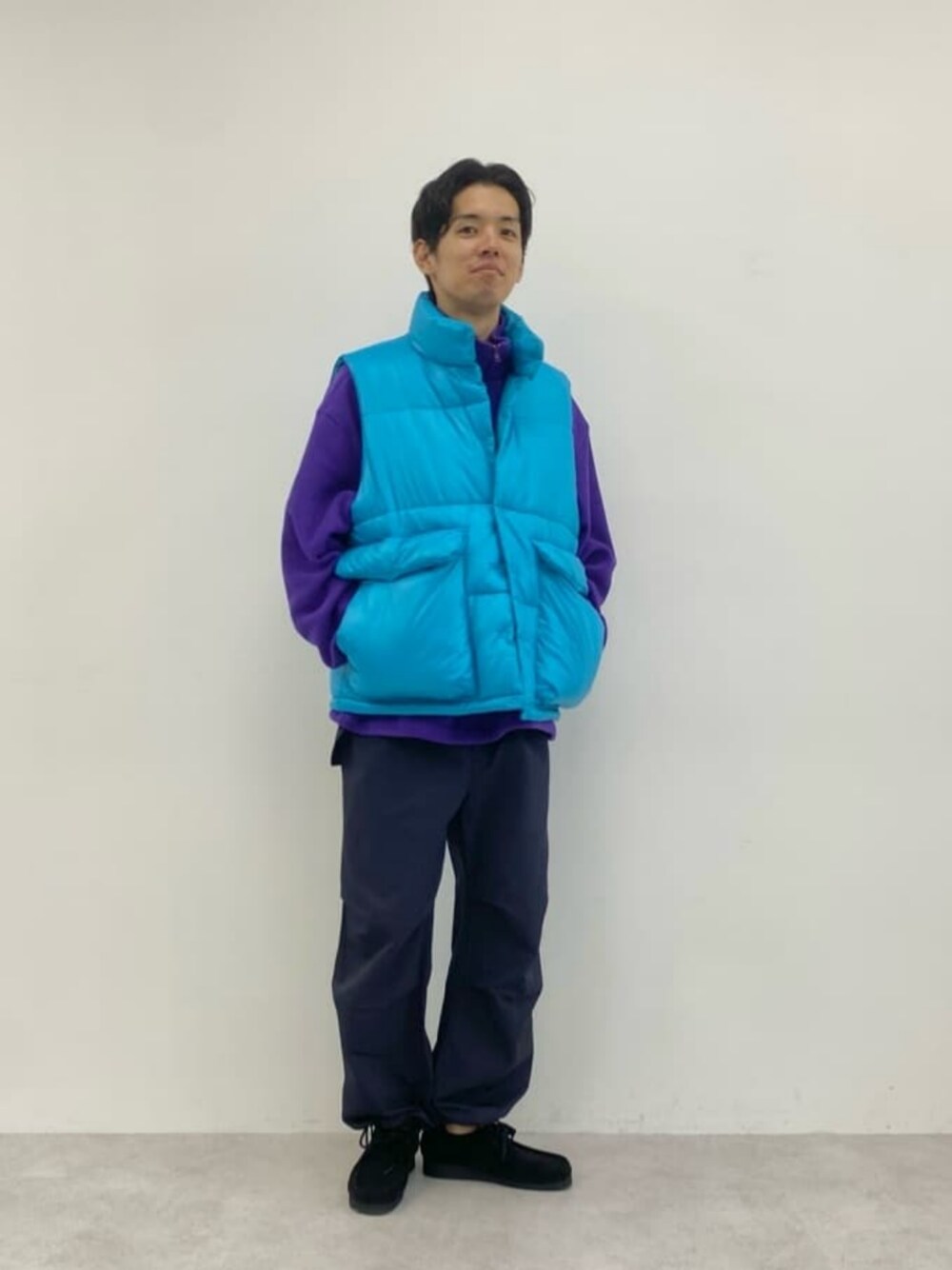 身長:178cm パープルのフリースに発色の良いダウンベストを合わせて、どこか懐かしいレトロな配色でスポーティーな雰囲気を意識しました。