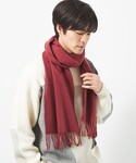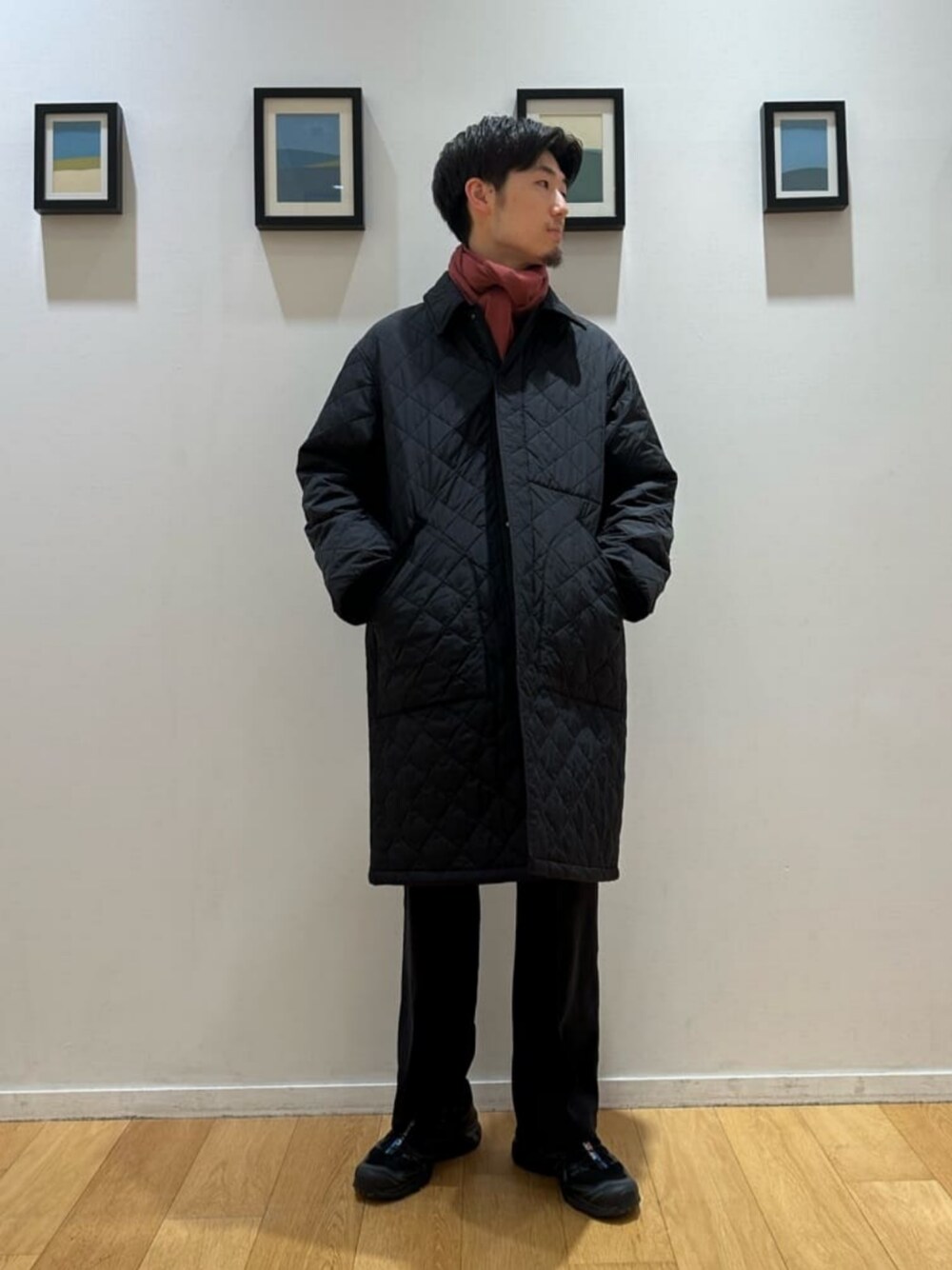身長:172cm 全体をブラックでまとめ、差し色で綺麗なワインカラーのマフラーを巻きました。