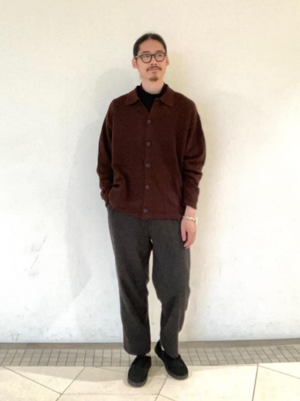 身長:178cm 茶の襟付きカーディガンでコーディネートを組みました。首元にアクセントをつける為タートルネックを合わせています。暗めでまとめて大人っぽくしています。