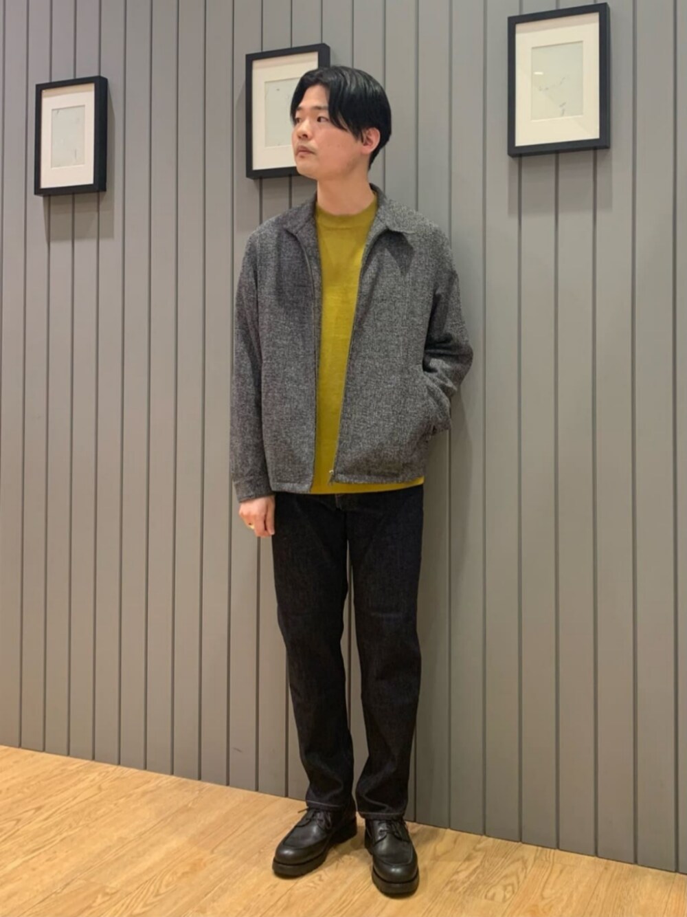 身長:177cm 秋らしいブークレ素材のジップブルゾンを落ち着いた雰囲気で合わせました。 インナーに合わせたマスタードカラーは、モノトーンに相性がいいので差し色としても使いやすいです。
