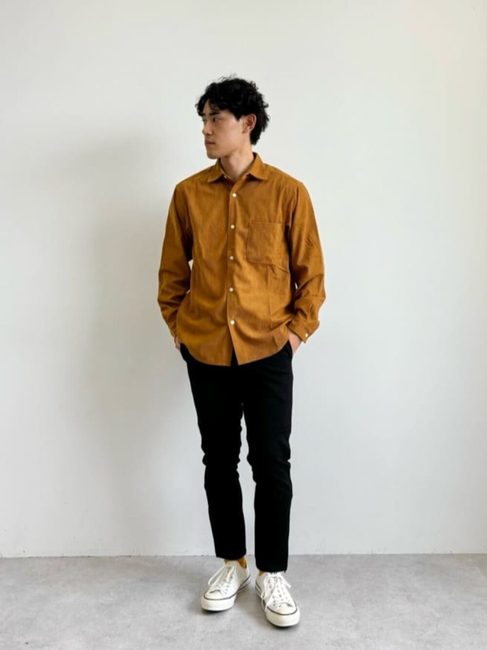 身長:171㎝ コーデュロイ素材のシャツを使っているのでカジュアルな印象で着ることができます。