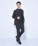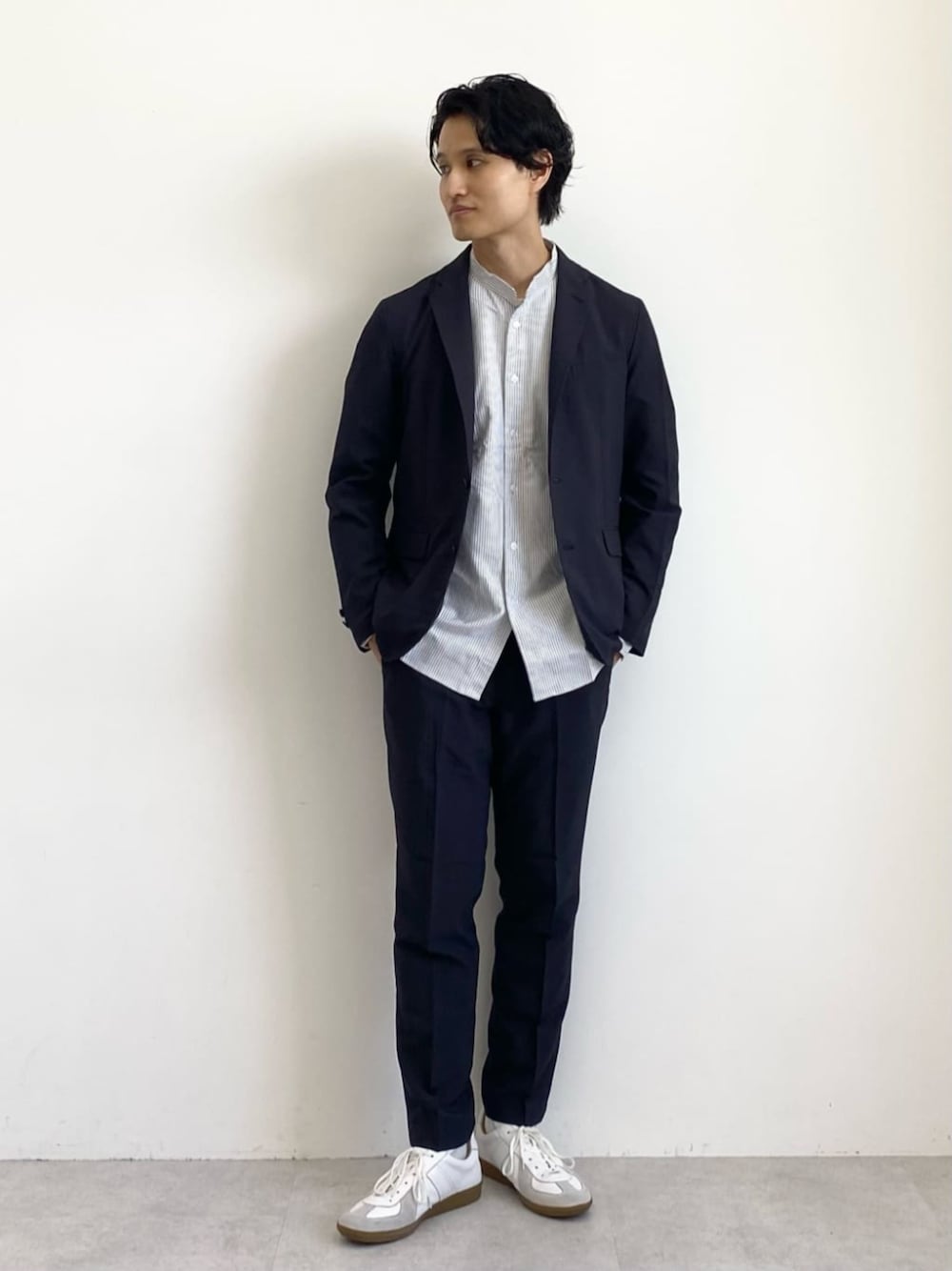 身長178cm EC限定商品着用。 セットアップにバンドカラーシャツを合わせたキレイめスタイル。 足元は清潔感の出る白で合わせています。