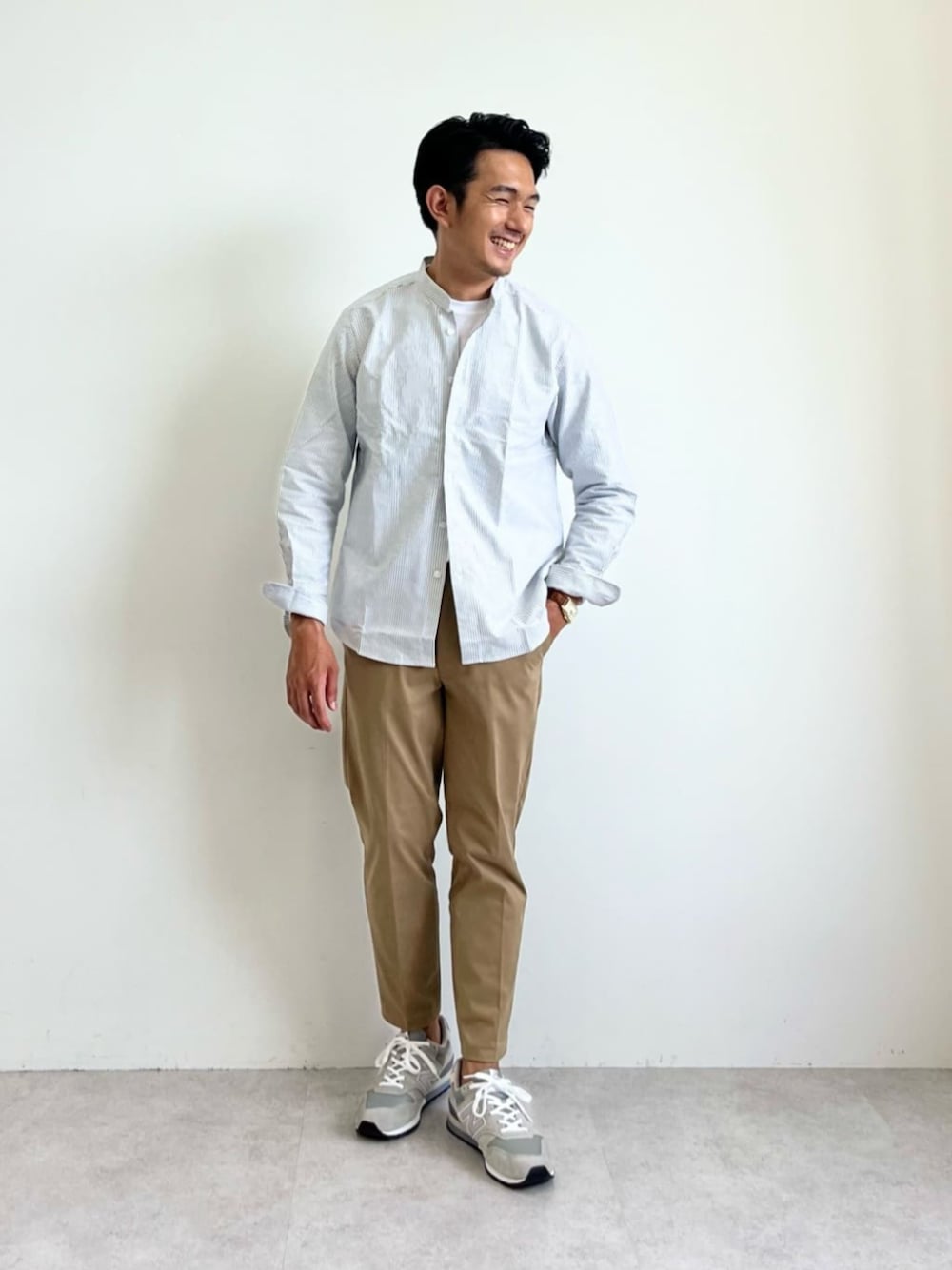 身長173㎝ オックスフォードシャツとチノスラックスの定番のカジュアルスタイル。 飾らないシンプルさが大人らしい上品な印象になります。