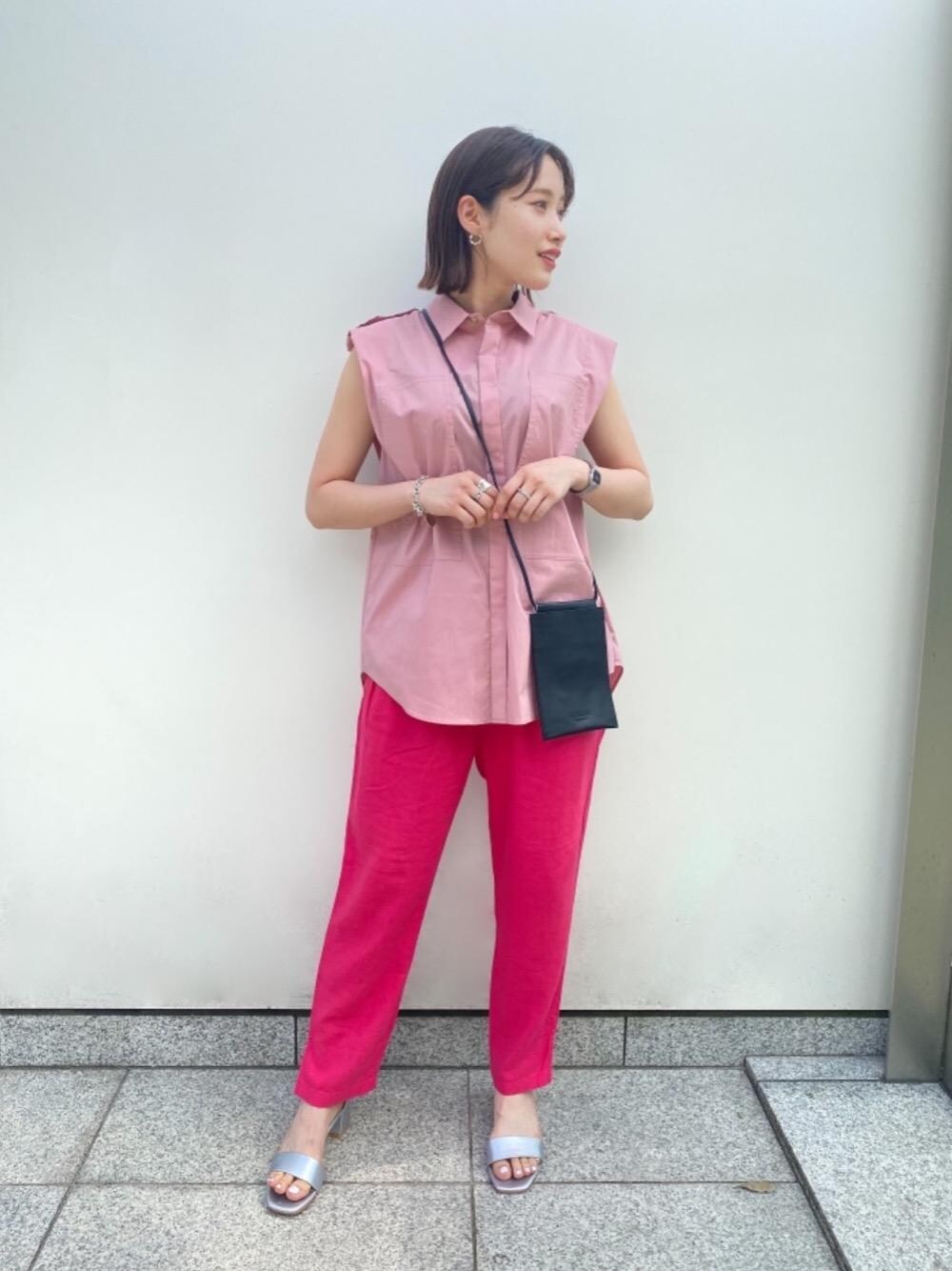 身長:157cm 着用サイズ:トップス(FREE) ボトムス(36サイズ) トップスとボトムスを同系色のピンクで合わせたコーディネート。 ボトムスは目を引くカラーが今っぽくておすすめです。