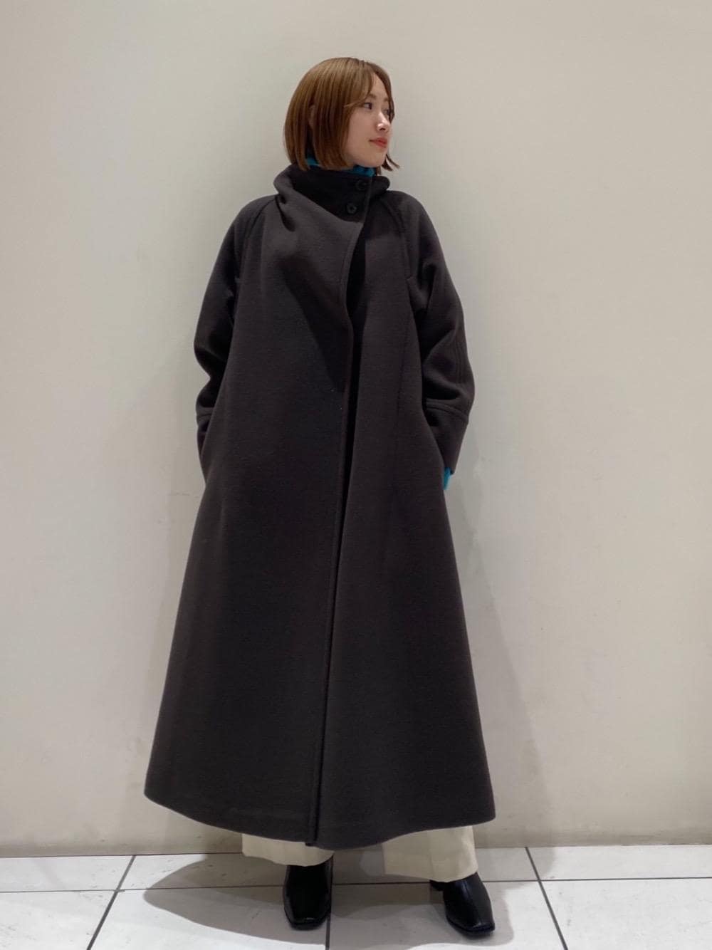 身長:157cm 普段サイズ:アウター38/ボトムス38サイズ/シューズ23.5cm 【サイズ感】 アウター:ゆったり トップス:標準的 パンツ:標準的 【コーディネートポイント】 コートから覗くブルーのニットがポイント。全体的に軽やかな印象になります◎