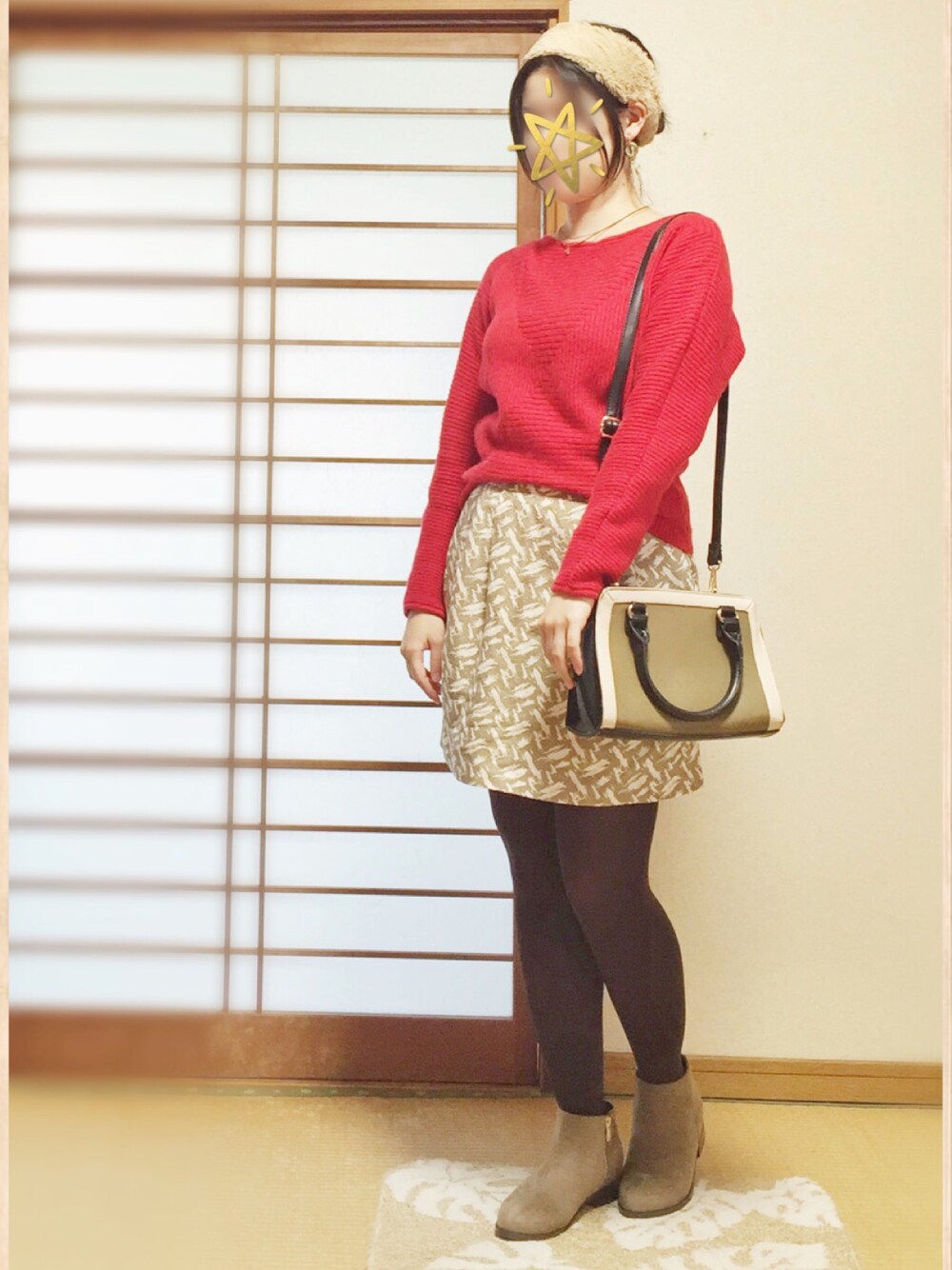 赤ニット着たかったコーデ。 スカートは昨年のアーバンリサーチの福袋品です😁自分では買わない形&柄ですが、案外合わせやすくてちょこちょこ履いてます。 朝から地震と津波のニュースでびっくりでした💦大きな被害がないことを祈ります。