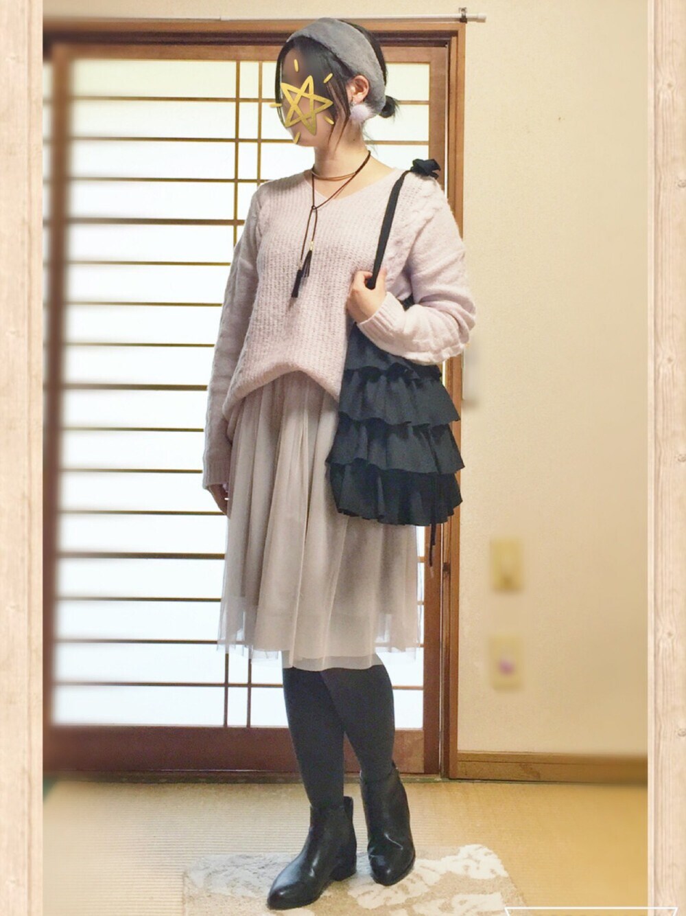 ラベンダー色のニットに、グレーのチュールスカート合わせ。 小物類は濃い色で締めました。 イヤリングのファーもラベンダー色。ファーイヤリングは秋冬限定ですが、アクセントになるので好きです😁✨