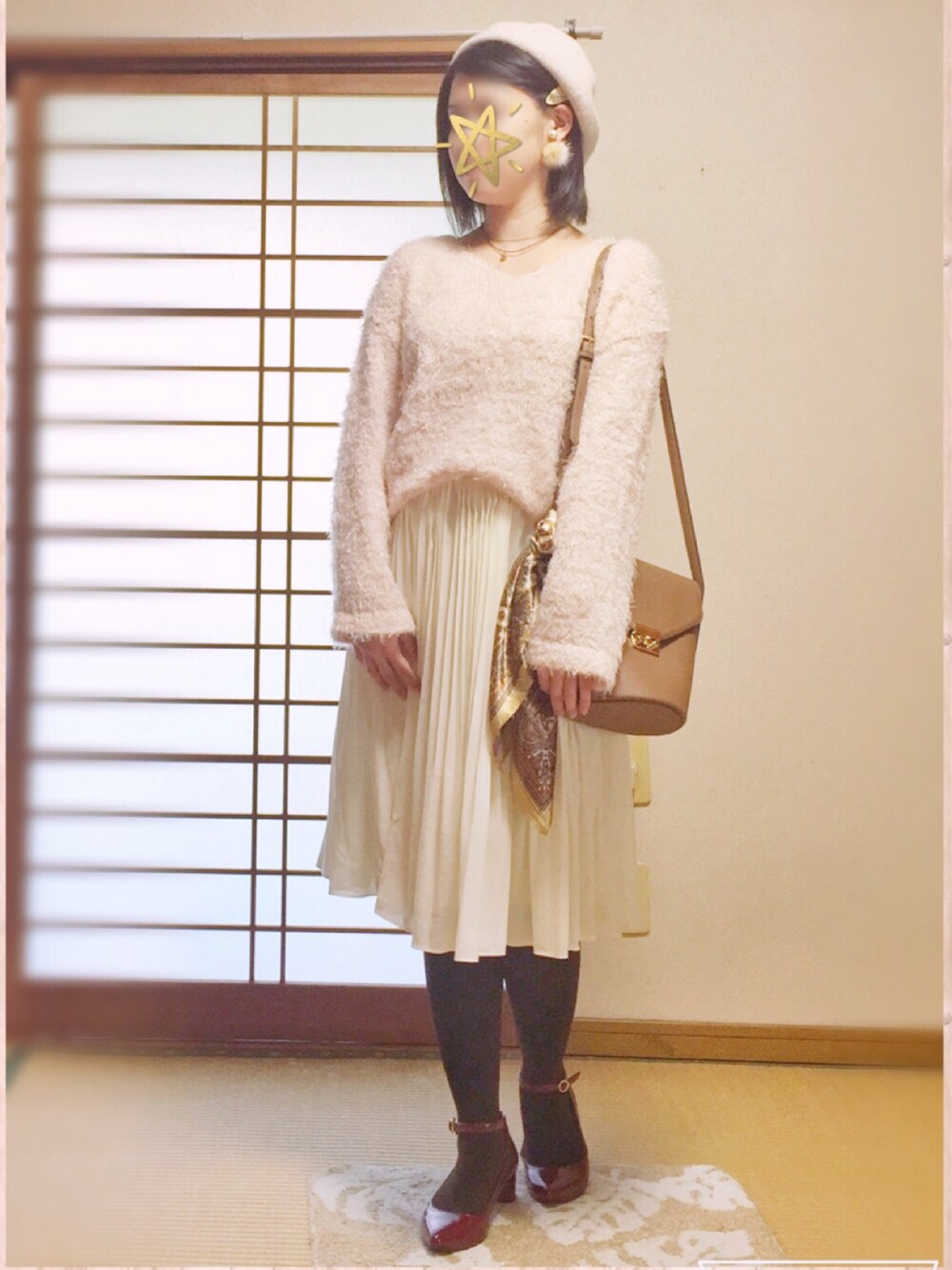 ピンクのフェザーヤーンニットに白プリーツスカートで淡色コーデ。 ニット、柔らか素材で着心地良いです✨