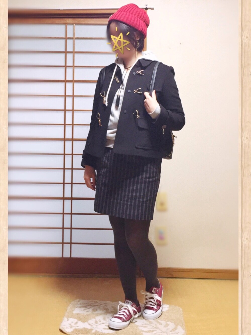 うん、むっちむち! モノトーンコーデに赤を差し色しました。 パーカー、ライダースみたいな形が可愛いです☺️もう何年も着てる年季モノです。