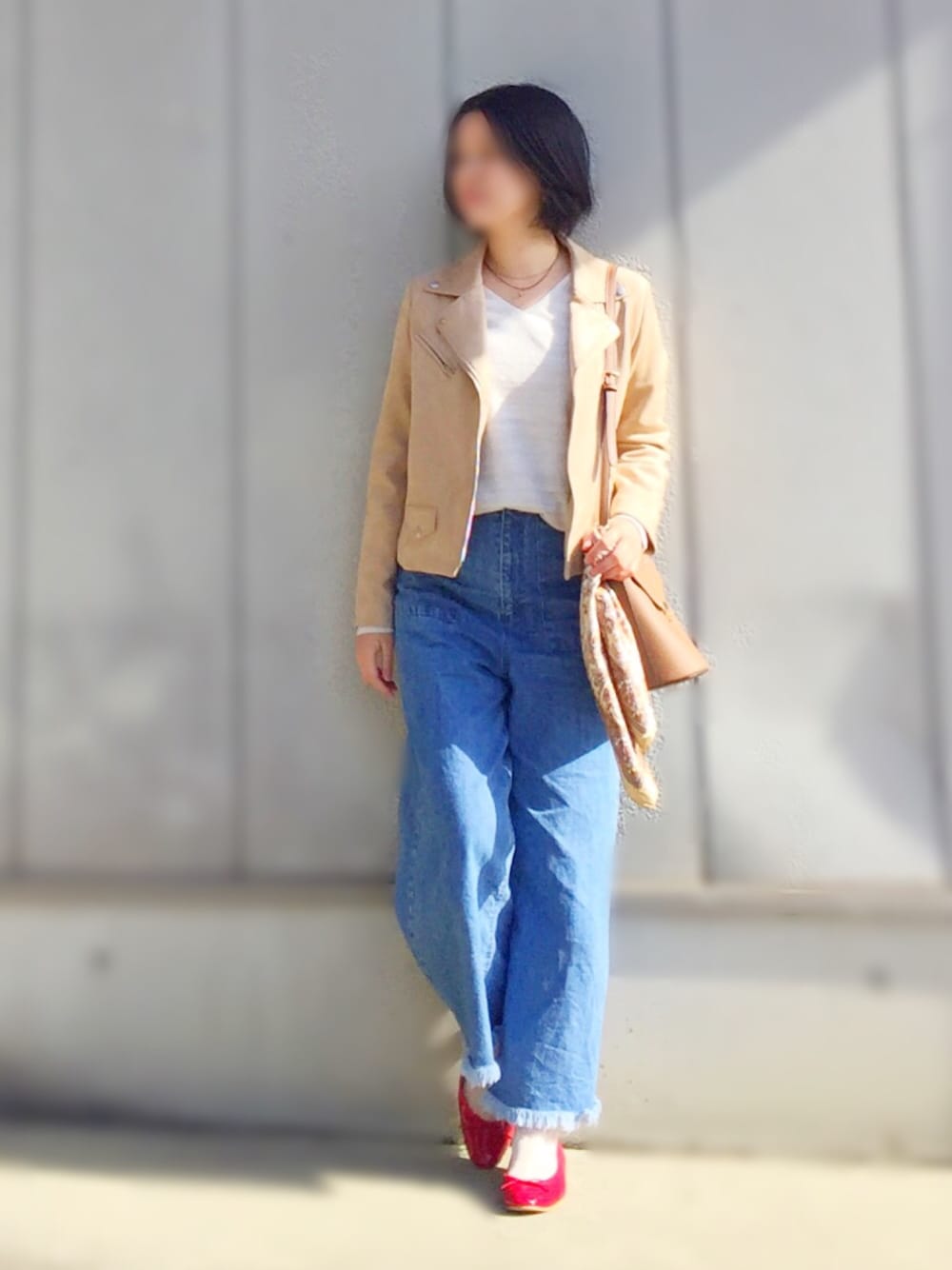 新しく購入した、フェイクスエードのベージュのライダース✨ 黒も好きですが、ベージュだと柔らかい印象になるのが良いです☺️黒ワンピースにも合わせたい! 赤い靴も好き過ぎて、赤い靴のコーデ見るとついつい いいね!&セーブしてまいます😆