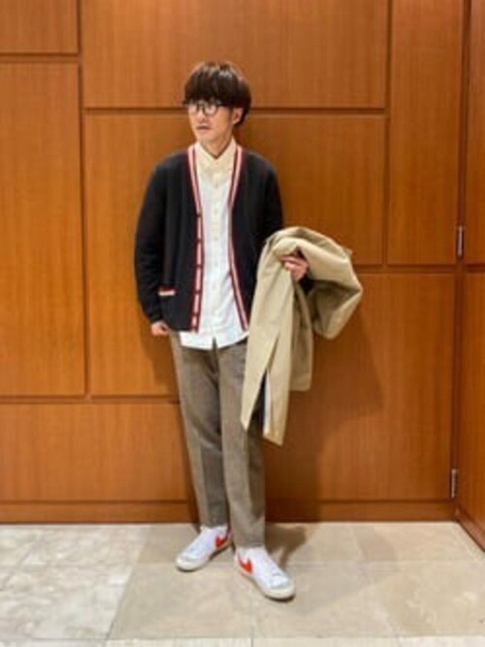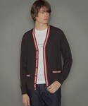 赤いラインが印象的なカーディガンはコーディネートの幅が広がります。春先にTシャツとの合わせもおすすめです!