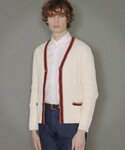 カーディガンを着用した、リラックスコーデです。配色、生地感により、存在感があるカーディガンなので、ジャケットの下に、差し色として着用して頂いても面白いと思います。