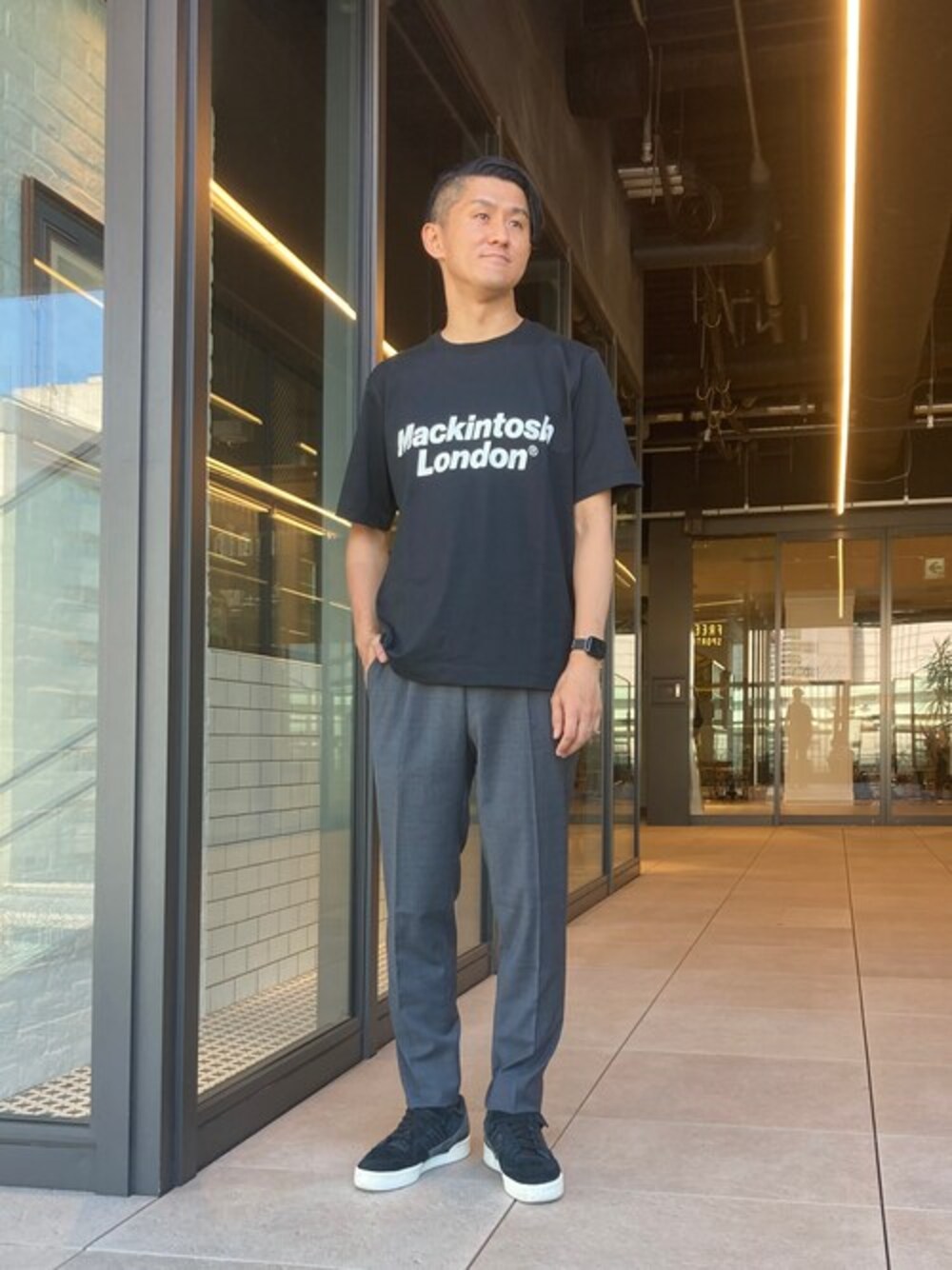 着用サイズ Tシャツ L パンツ38 マッキントッシュ ロンドンのブランドロゴのTシャツをややリラックスした感じで、サイズアップして着用しました。 ボトムスにはウール・ポリエステルのイージーパンツを合わせて、砕けすぎないキレイめスタイルにしました。