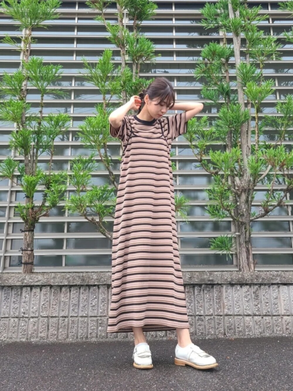 ARINA / 杉本侑菜のワンピース「【forksy.】マルチボーダーアンサンブルワンピース/半袖Tシャツ&キャミソールワンピースセット」を使ったコーディネート