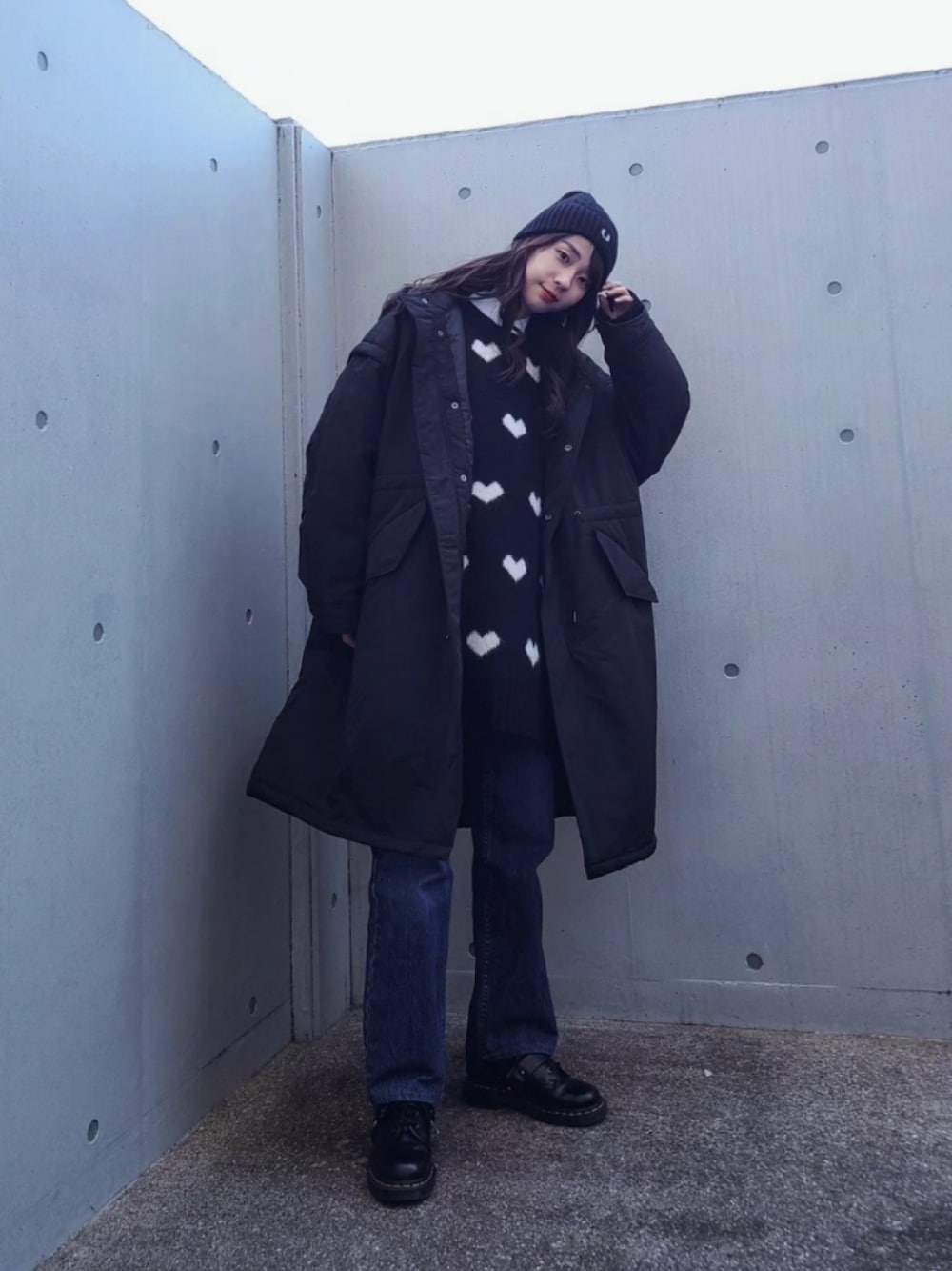 ワイドシルエットのモッズコート🖤 ハート柄のニットとシャツを重ね着しました🤍 . . . リップはCHANELとM・A・Cを重ねて塗ってます💄どちらもお気に入りのリップです🥰 . . Instagram⏩️arity_1215