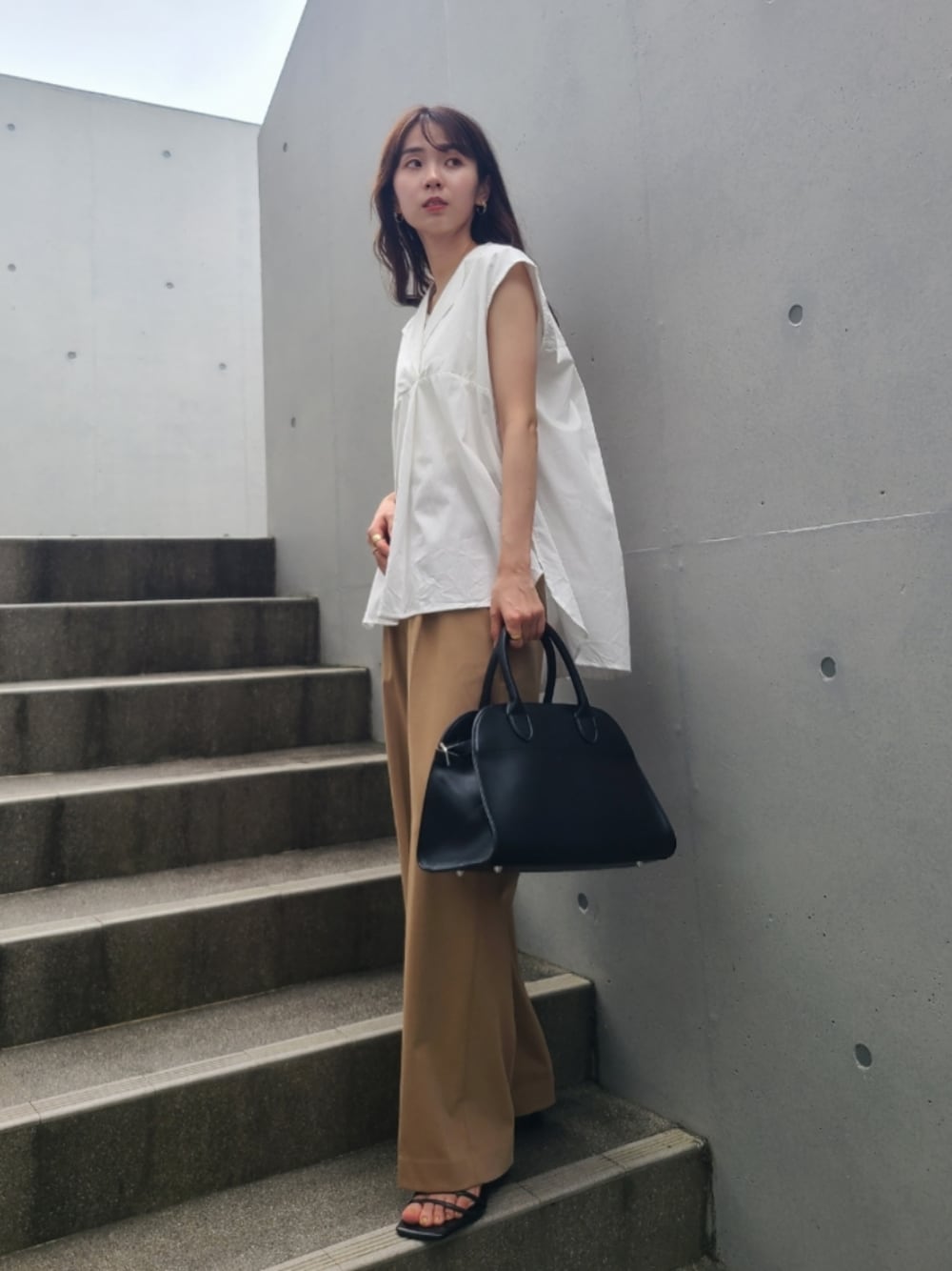 シンプルにシャツ×ワイドパンツ ノースリーブでも過ごせる季節になってきた☺️🌻 梅雨も夏も楽しみましょう☂️🍬🤍