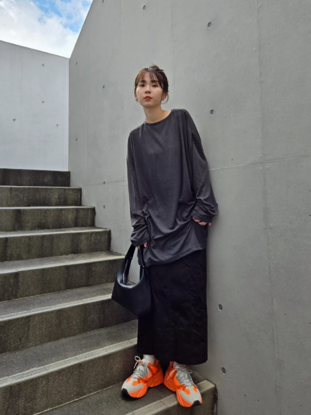 透け感のあるゆったりシルエットのロンT! 差し色にオレンジスニーカーをチョイスしました🍊