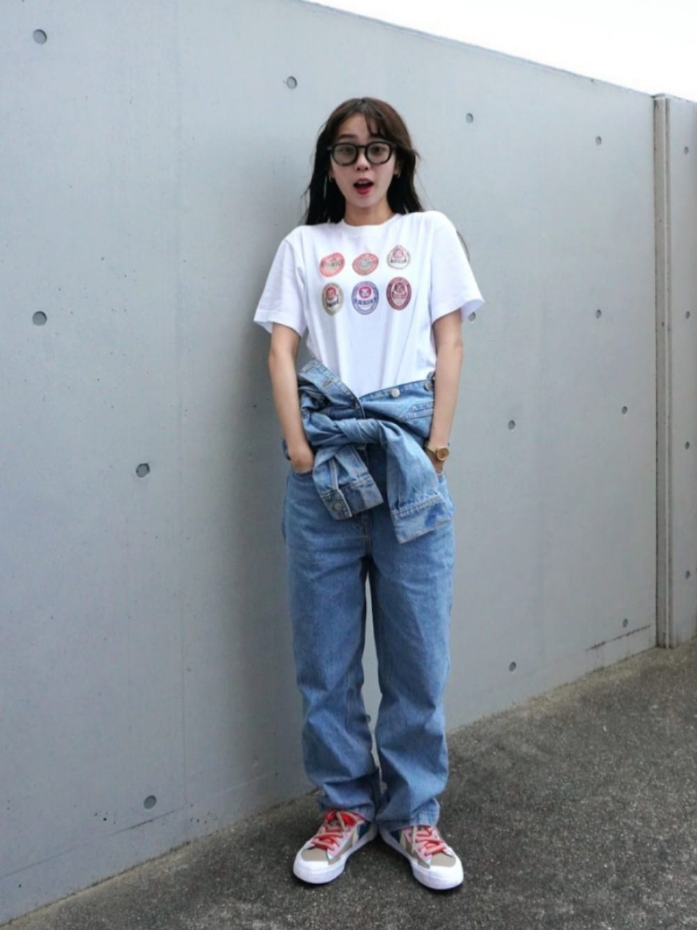 ヱビスTシャツです👕💛 デニムのジャンプスーツを腰巻きスタイルにして 着回しコーデに☺️ Instagram⏩arity_1215