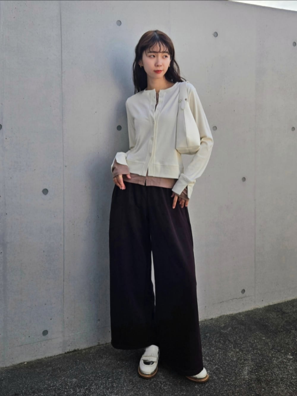 1枚なのにレイヤードしているように見えるお気に入りのカーディガン✨ 秋にぴったり🍂 ブラウンパンツに合わせたブラウン×ホワイトコーデです🌰 Instagram⏩arity_1215