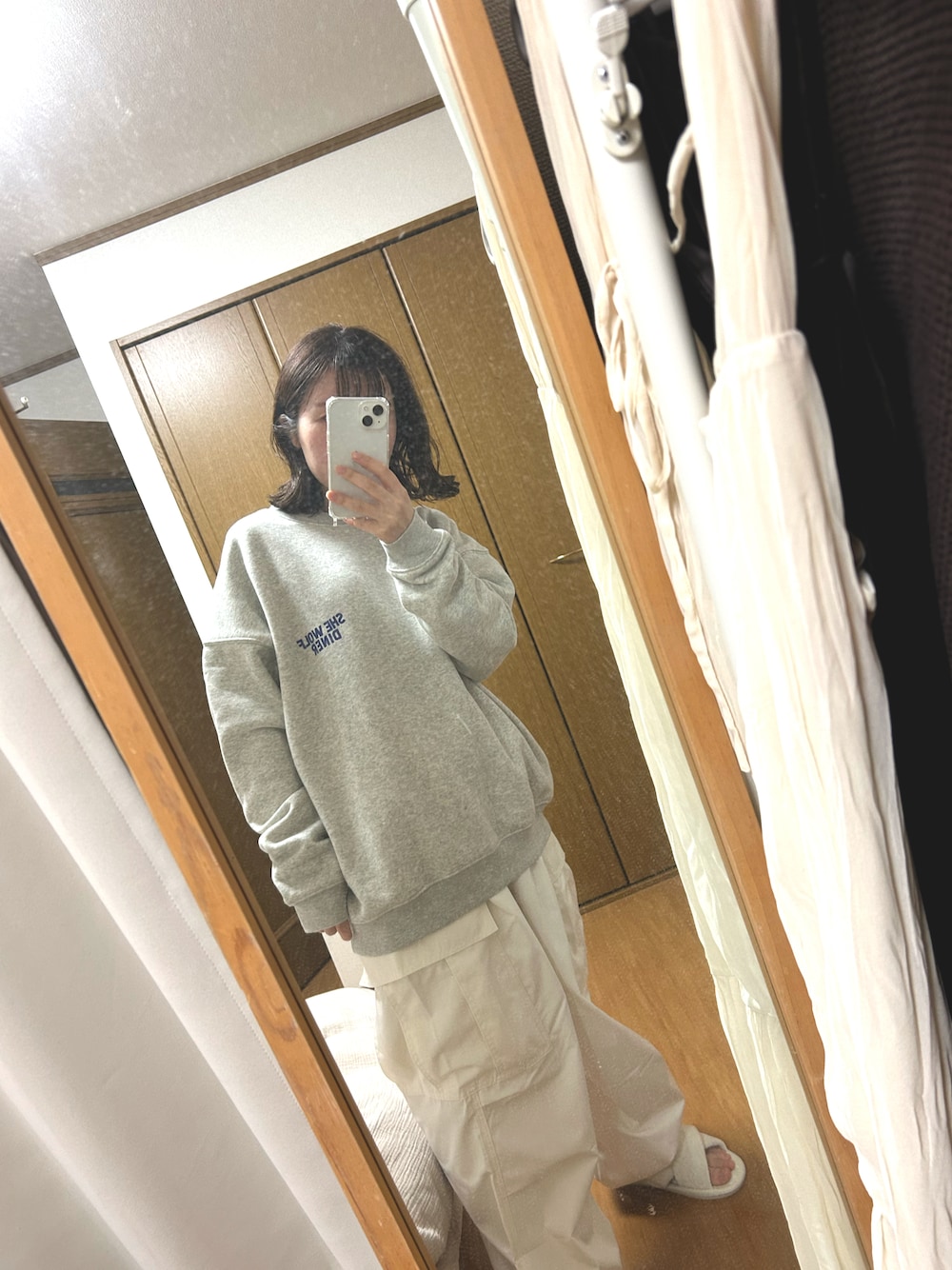 ひかのスウェット「WEB限定 SHE WOLF DINER×FREAK'S STORE/シーウルフダイナー 別注 ビッグシルエット バックプリント クルーネックスウェット」を使ったコーディネート
