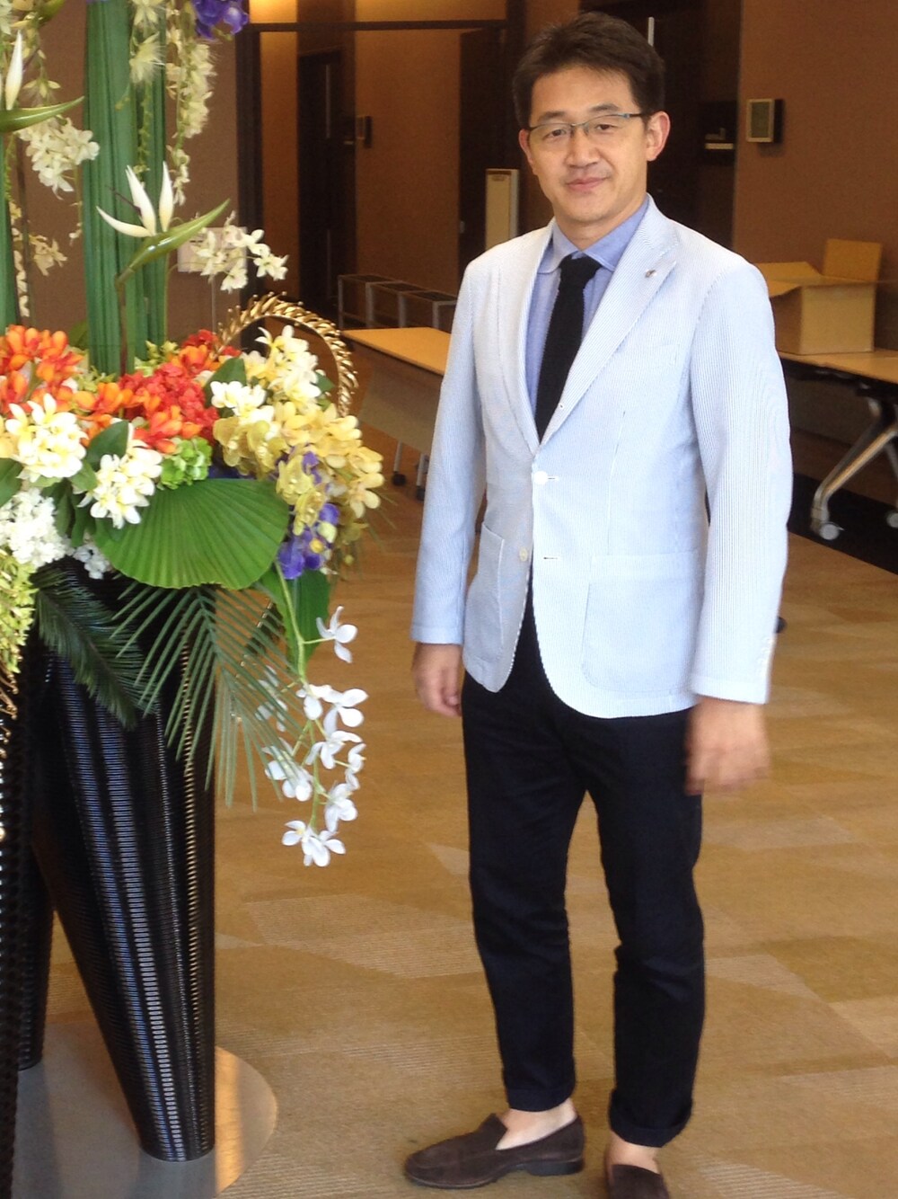 真夏のカンファレンス。スーツでは見た目が暑苦しくなるので、ジャケットにシアサッカー素材を持ってきて爽やかな感じにしてみました。パンツも肩苦しくならないよう軽くロールアップ。