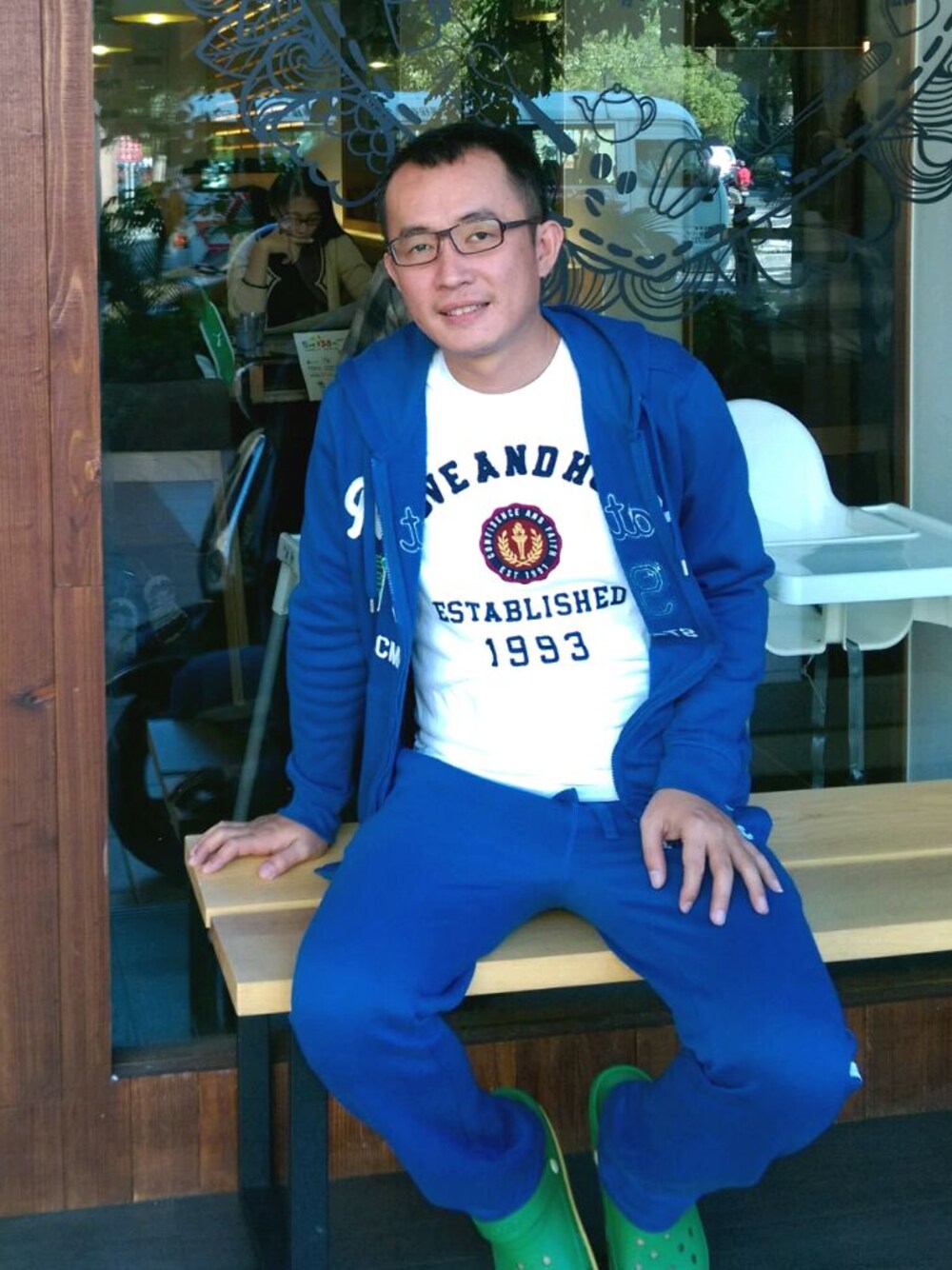 上下對色,內搭白色T-shirt