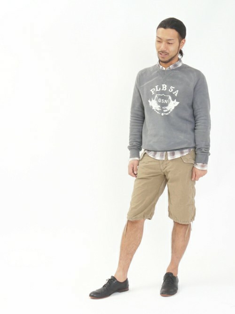トレンド感のあるシャツとスウェットのMIXスタイルがGOOD。 ボトムは季節感を出すようにショーツをチョイス。