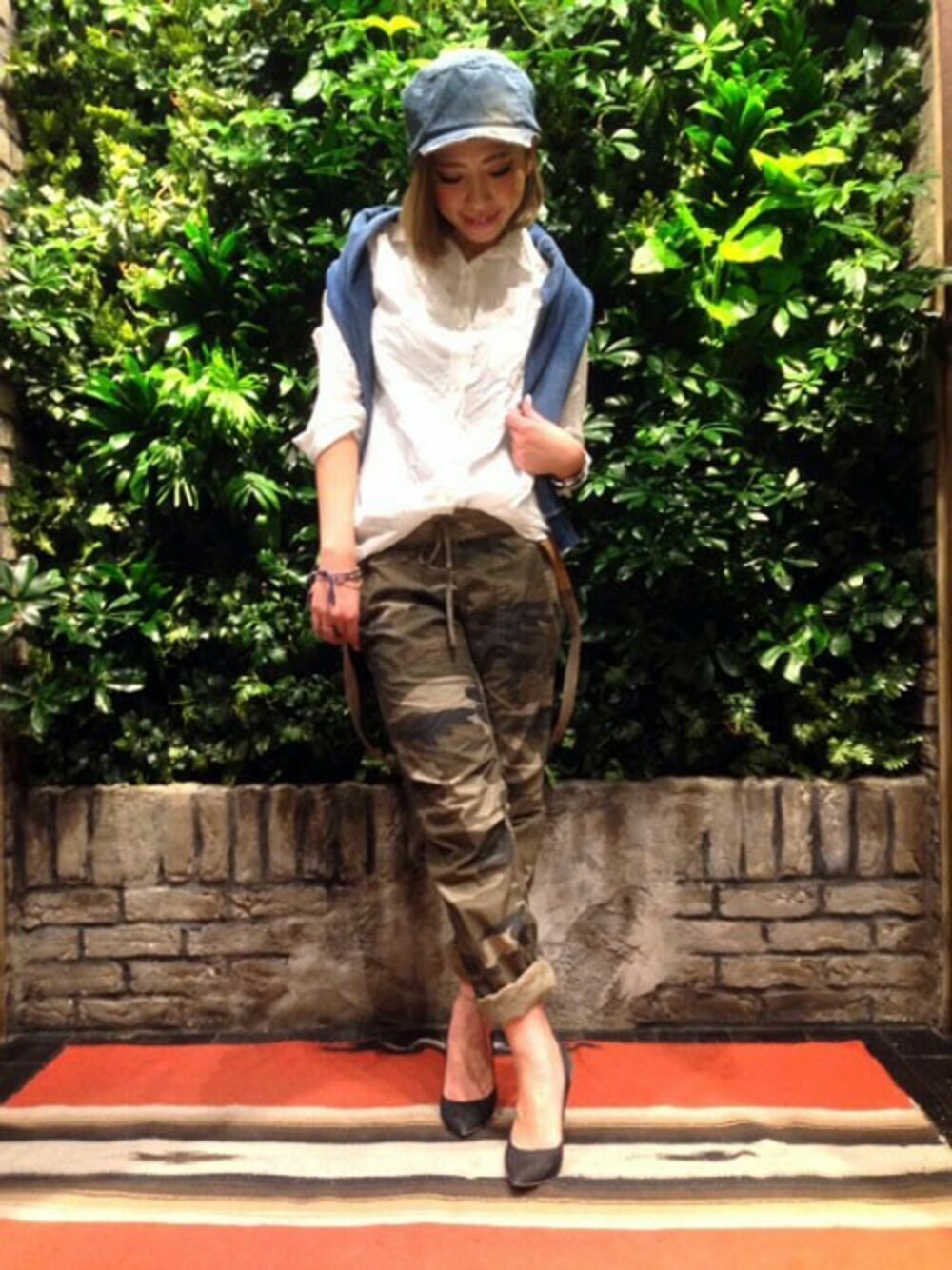 迷彩のカーゴパンツがお気に入り♪♪今年は白シャツとヒール合わせですこし大人に着こなします!