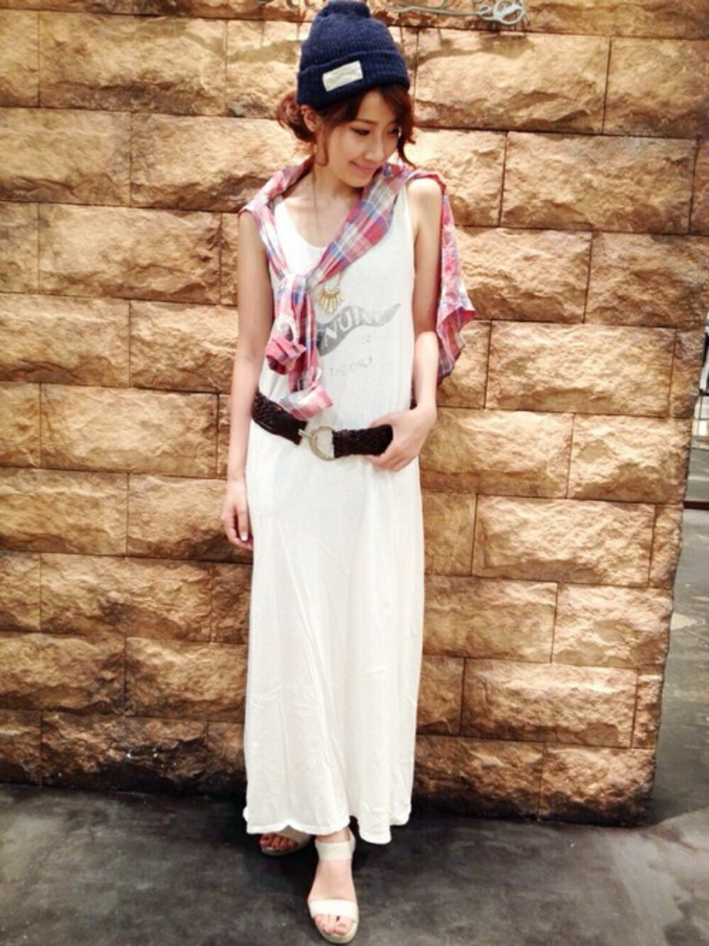 ホワイトのマキシワンピースはカジュアルでもヌケ感があって大好きです☆ チェックシャツをさし色にしてポイントに☆